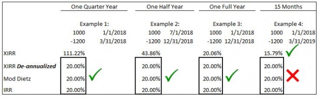 Using a De-Annualized XIRR is the most straight-forward approach, and it will calculate performance within a few basis points of the Modified Dietz formula published in the GIPS standards and the earlier AIMR-PPS white book since 1993 as a good approximation of IRR. The Modified Dietz formula is a more manual view into how performance is derived and a useful reasonableness check for periods up to one year.