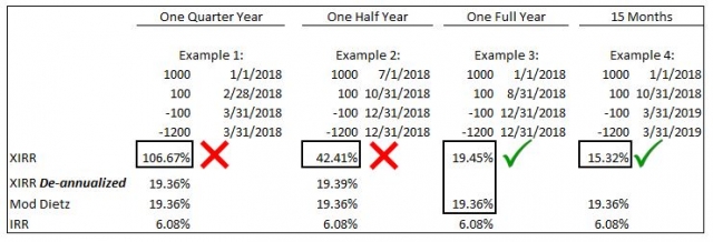 Excel XIRR – it’s great for periods of one year or more, because it’s an annualized return, which is required in the proposed 2020 GIPS provisions1. The XIRR formula in Excel also allows daily dates to be entered in the calculation, so that cash flows are weighted daily during the period, another proposed GIPS requirement for MWRs2. However, the GIPS standards prohibit firms from annualizing performance for less than a year, because annualizing returns for periods less than one year inflates the results by the assumption that assets could be reinvested and earn the same return over and over again for a full year. The four XIRR results below demonstrate how unadjusted XIRR will calculate very different returns for the same cash flow streams (same starting value, interim cash flow 2/3 of the way through the period and ending flows/value). The differences in the XIRR results are due to the dates entered in the Excel XIRR formula.