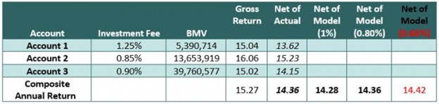 In the fee illustration below, a firm using a 1.5% model fee in its GIPS Composite Report decided to lower its fees to be closer to 1% to be competitive with other firms. The 1.5% model fee was no longer representative of the entire composite, so the firm completed an analysis of the members of the composite to determine if they could lower their model fee prospectively.